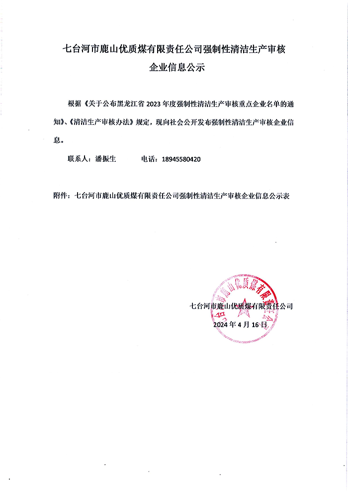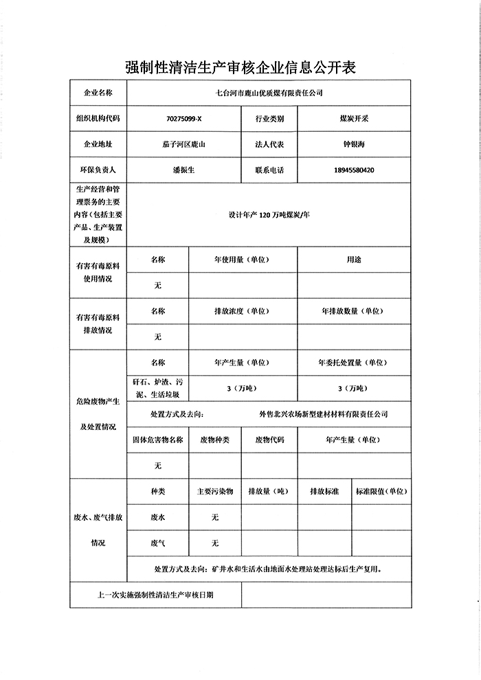 七臺河市鹿山優(yōu)質(zhì)煤有限責(zé)任公司強(qiáng)制性清潔生產(chǎn)審核企業(yè)信息公示